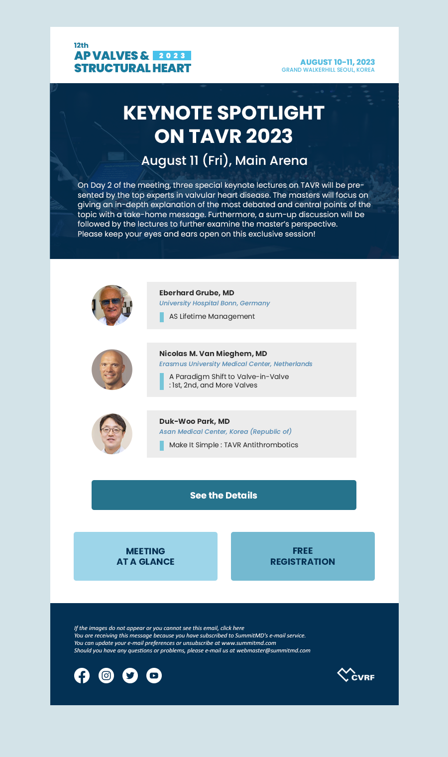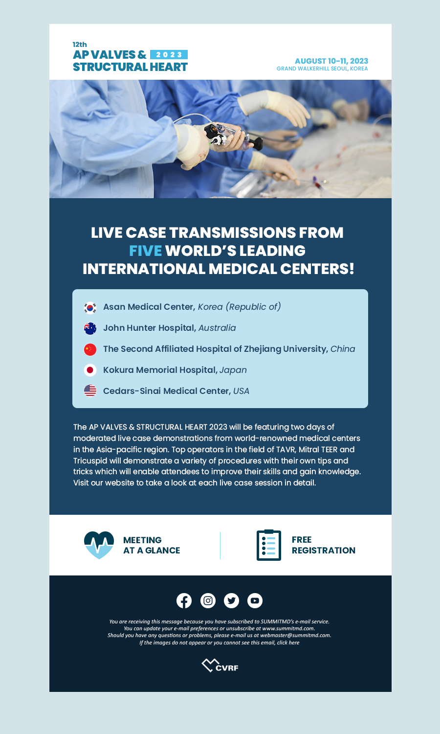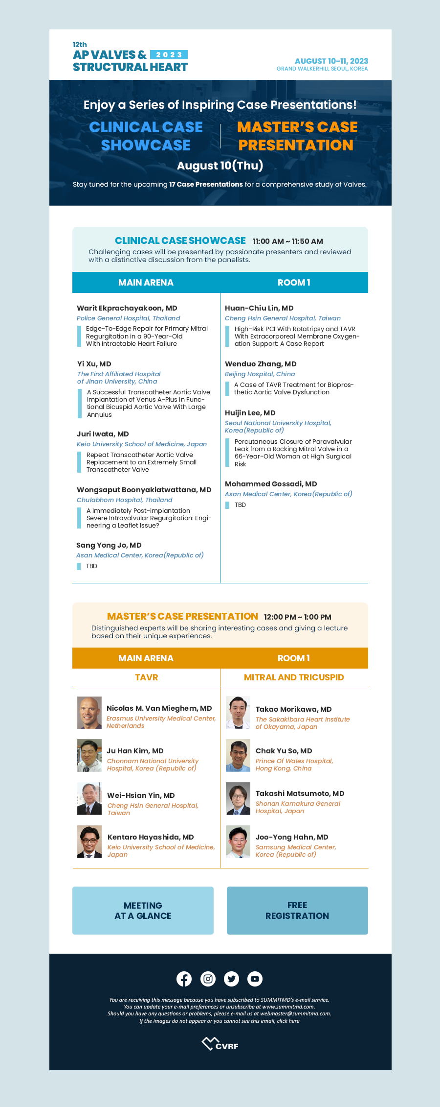 八月流金,骄阳似火。在这炎炎夏日,我们迎来了第12届韩国首尔亚太瓣膜会。AP VALVES & STRUCTURAL HEART 2023是由CardioVasucular Research Foundation(CVRF)和Asan Medical Center(韩国首尔)主办,数百位专家参与,以极具启发性的手术直播和专题讲座为特色的国际型手术会议。会议聚焦经皮瓣膜植入技术的概念和进展,经导管瓣膜治疗所需的必备技能,瓣膜性心脏病当前和未来的治疗选择等,并创新性地针对心脏瓣膜病诊疗中的争议提出了最新解决方案。2023年8月10-11日,韩国首尔不见不散。