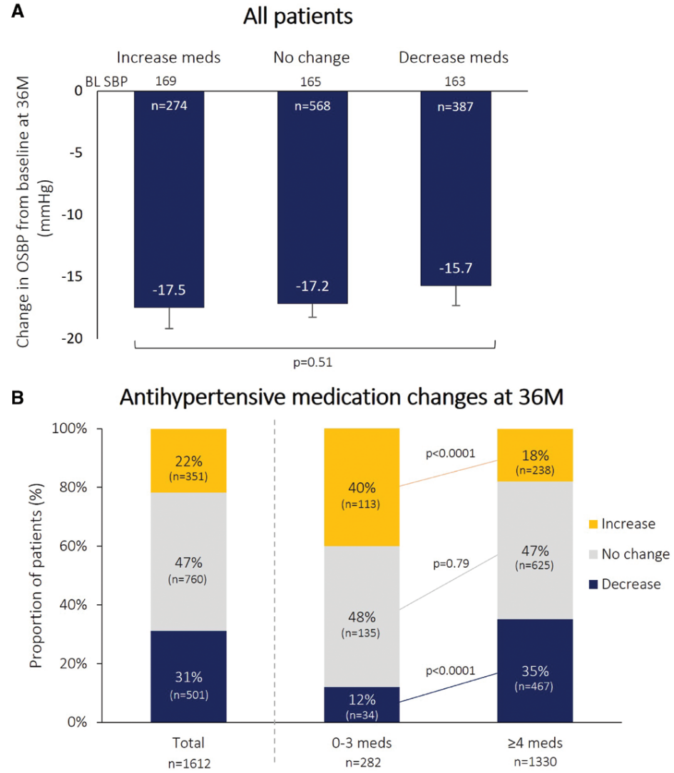 36个月时,增加、不变和减少药物组的诊室收缩压分别比基线时显著下降-17.5、-17.2和-15.7 mmHg(均P<0.0001),各亚组间比较差异无统计学意义(P=0.51;图2 A)。36个月时舒张压的变化情况类似。