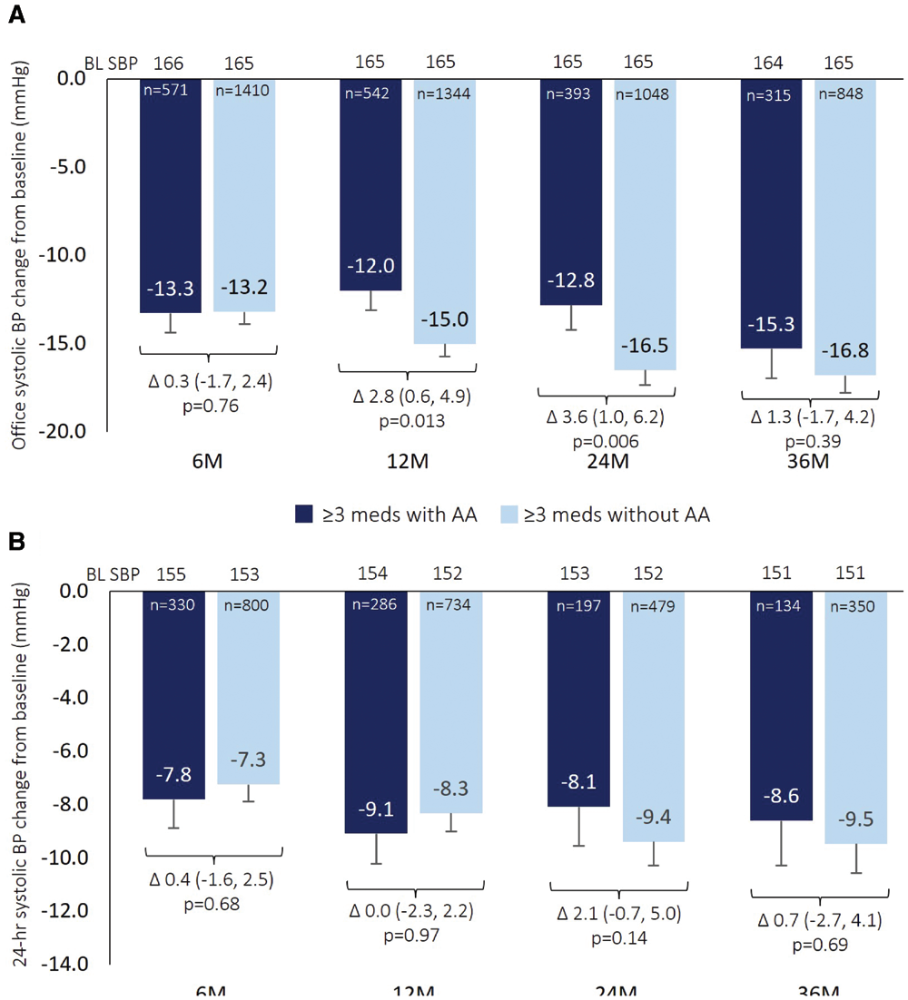 36个月时,在基线时服用≥3种抗高血压药物(包括醛固酮拮抗剂)的顽固性高血压患者的诊室和24小时收缩压分别下降-15.3和-8.6mm Hg(图4);基线时未使用醛固酮拮抗剂的顽固性高血压患者的诊室和24小时收缩压分别下降-16.8和-9.5 mmHg(图4)。12个月和24个月时,未使用醛固酮拮抗剂的患者的诊室收缩压降低更显著(P=0.013,P=0.006,图4A)。两组的24小时收缩压在任何随访时间点比较均无显著差异(图4B)。