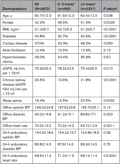 患者平均年龄为61±12岁,其中女性占42.2%。基线诊室收缩压为166.0±24.8mmHg,基线24小时收缩压为154.5±18.6mmHg。患者平均服用4.6±1.4种降压药物。18%的患者服用0~3种降压药物(0~3种降压药组),82%的患者服用降压药物≥4种(≥4种降压药组)。