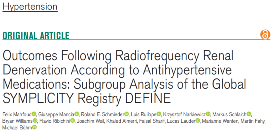 多项试验表明,经导管去肾交感神经(RDN)术是一种安全、有效且持久的降压方法,可在有或无降压药物的情况下降低患者的血压。Global SYMPLICITY Registry DEFINE是针对大规模高血压患者开展的评估射频RDN术后疗效的研究。