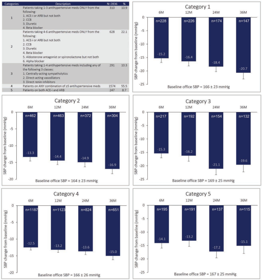 总体而言,36个月时,诊室和24小时收缩压较基线时分别降低-16.7±28.6和-9.1±20.2mm Hg (P<0.0001);诊室和24小时舒张压分别降低- 6.3±16.2和- 4.6±12.1mm Hg (P<0.0001)。