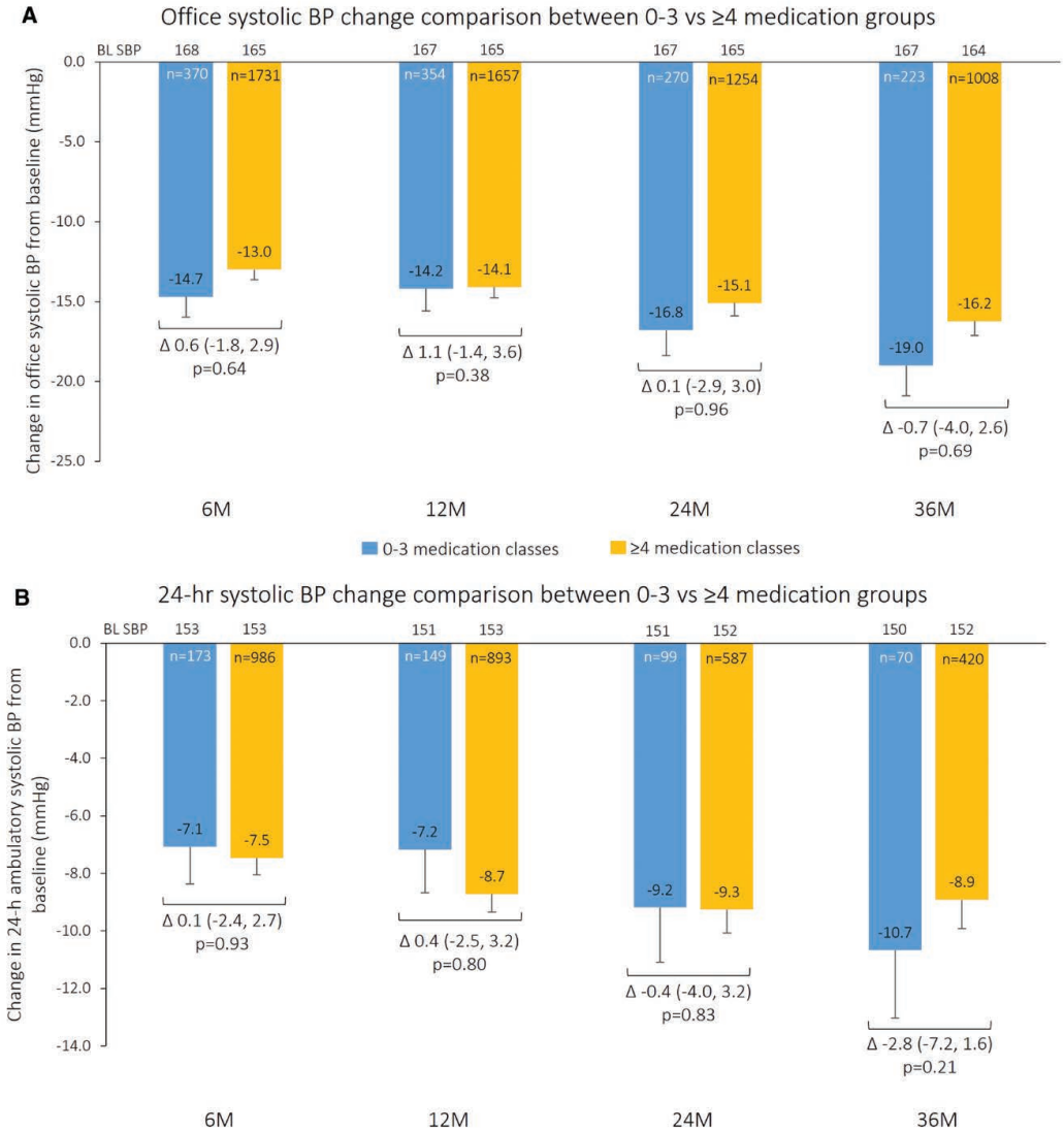 纳入接受射频RDN治疗的高血压患者,并根据基线降压药物类别(即同一类别的2种降压药物计为1类)将患者分为两个主要组别,包括0 ~ 3种药物组和≥4种药物组。比较两组患者的基线特征、36个月内血压变化和不良事件(心肌梗死、中风、因心力衰竭住院、心血管死亡、全因死亡和包括上述所有事件的复合事件)发生率。
