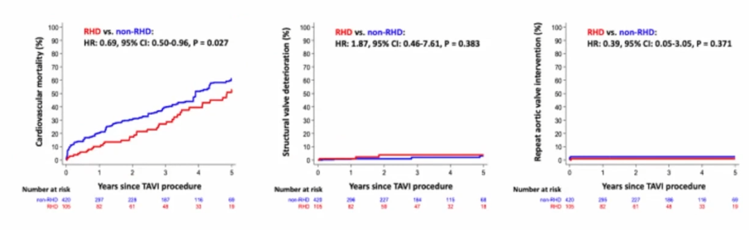 将匹配队列延长随访至5年的数据与1年的分析一致,风湿性AS患者在5年时的心血管死亡率低于退行性AS患者,两组间瓣膜衰败及再次主动脉瓣介入或外科手术的发生率无显著差异。