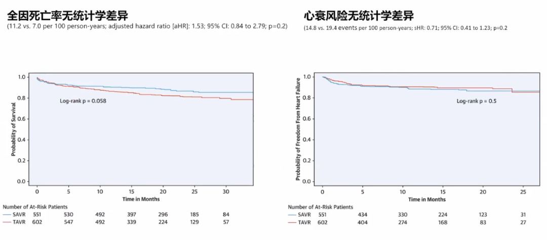 TAVR与SAVR对比,在全因死亡率和心衰风险方面,均无统计学差异。