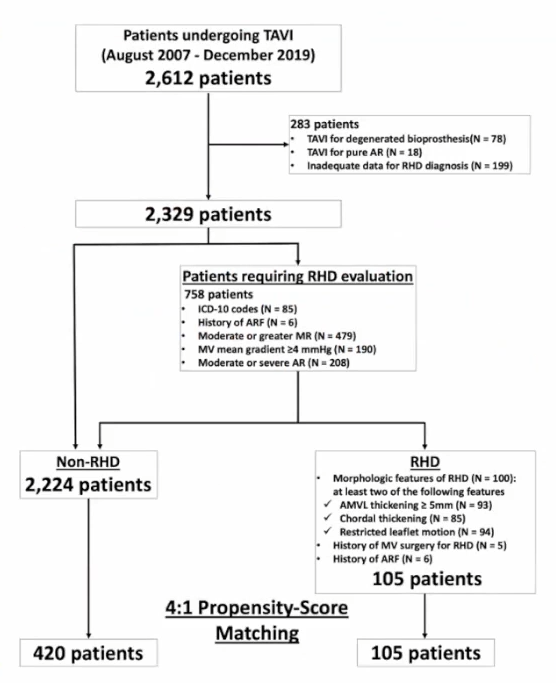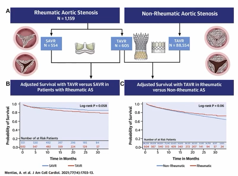 经过19个月的中位随访,风湿性AS患者中,TAVR与SAVR的全因死亡率没有差异;经过17个月的中位随访,与非风湿性AS的TAVR相比,风湿性AS TAVR后的死亡率也没有差异。