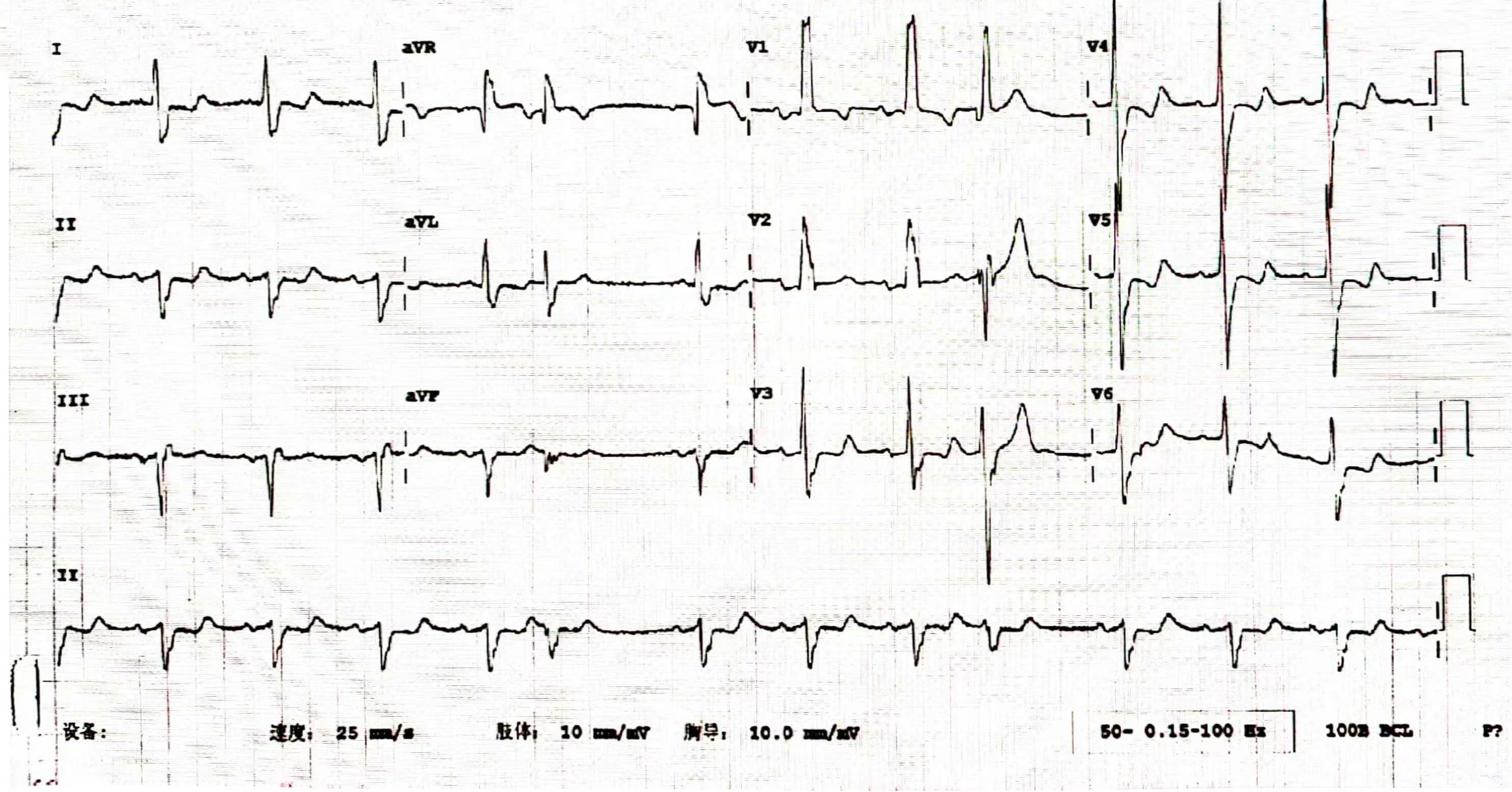 心电图提示:频发室性早搏,RBBB,V3-V6导联T波倒置、双向。