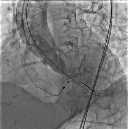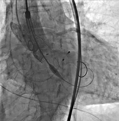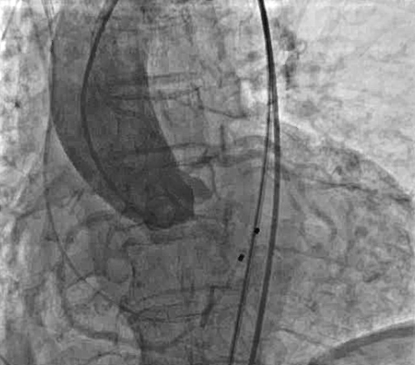 使用直头超滑导丝跨瓣后交换加硬导丝,行球囊扩张主动脉瓣,球囊扩张时行升主动脉造影,评估冠脉风险。