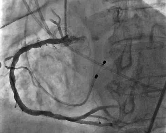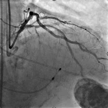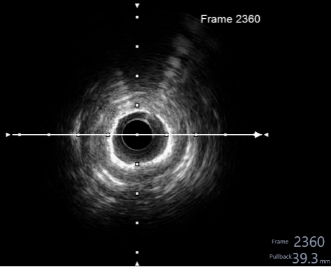 冠脉造影及介入治疗:将ACIST CVi血管造影注射系统调整至冠脉造影模式,完善冠脉造影。结果示:LM未见明显狭窄,LAD近端80%狭窄,严重钙化,IVUS可见360°钙化。回旋支少量斑块浸润,右冠状动脉30-40%狭窄。决定处理LAD,由于患者存在严重钙化,使用Shockwave球囊预处理打开钙化,后植入3.0*24mm +3.5*24mm药物涂层支架,效果满意。