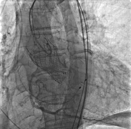 术后造影:以升主动脉模式造影显示瓣膜工作良好,少量瓣周漏,冠脉未受影响。术后测跨瓣压差5mmHg,主动脉瓣口峰值流速186cm/s。