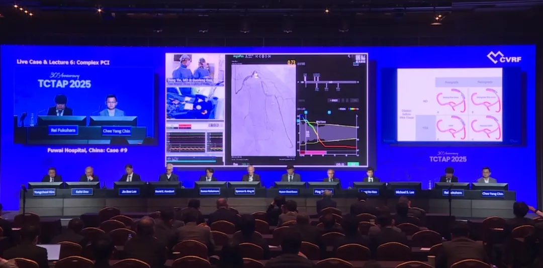 TCTAP 2025特邀中国医学科学院阜外医院窦克非教授团队尹栋教授,高国峰教授向全球心血管医生在线直播了一台高难度的冠状动脉慢性完全闭塞(CTO)经皮冠状动脉介入治疗(PCI)手术。面对三支病变的复杂PCI,窦克非教授团队尹栋教授,高国峰教授在术前对患者的冠状动脉影像进行了全面而细致的分析,术中凭借熟练的技术,规范、精细的操作,密切流畅的团队配合,手术顺利完成,获得与会嘉宾学者的一致认可与高度赞扬,充分展示了中国术者在复杂PCI领域的卓越水平与非凡成就。
