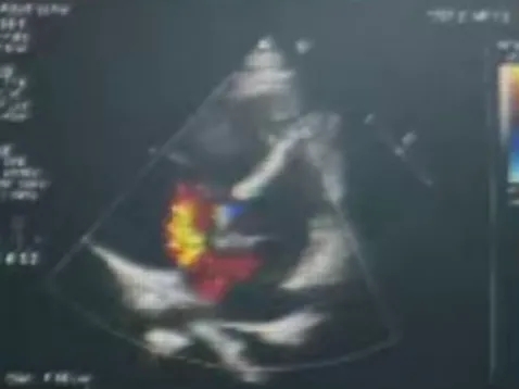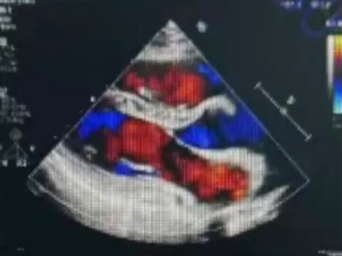 超声描述:右心增大,余房室腔内径正常范围,室间隔及左室壁各节段厚度正常,运动协调,收缩幅度正常。房间隔中部回声脱失约11×15mm,主动脉侧短小残端,余残端尚可,房间隔总长42mm;室间隔延续完整。三尖瓣关闭欠佳,余瓣膜形态,结构,启闭正常。大动脉关系、内径正常。心包腔未见异常。