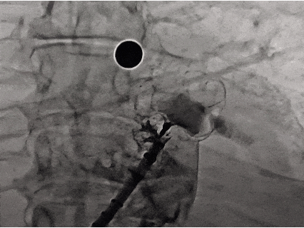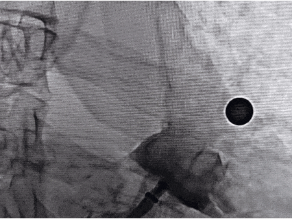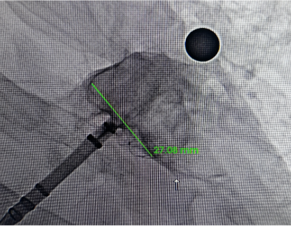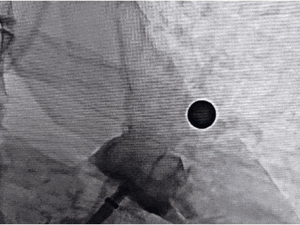 术中采用退鞘法进行封堵器展开,封堵器展开后肝位即刻造影,封堵器肩部位于左心耳开口处,位置合适,上下缘无造影剂漏;牵拉时有明显回弹,且牵拉后封堵器位置无移动;测量其压缩比为14.4%,符合PASS释放原则,释放后封堵器形态良好,位置稳定,造影无残余分流,无露肩。