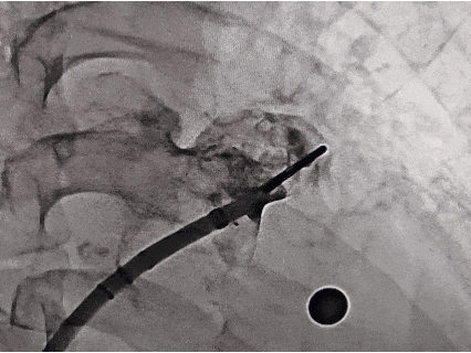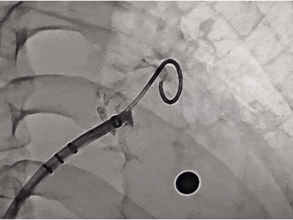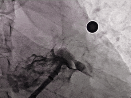 本病例诊断阵发性房颤,因“双下肢乏力1月余,加重伴气促”入院,诊断心房颤动、缺血性脑血管病、高血压病3级、大脑动脉闭塞脑梗死、冠状动脉粥样硬化性心脏病,CHA2DS2-VASc评分6分,HAS-BLED评分3分,具有高危卒中风险、高出血风险,行左心耳封堵手术。排除手术禁忌后拟行极简式左心耳封堵手术。穿刺位点需靠后靠下。