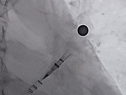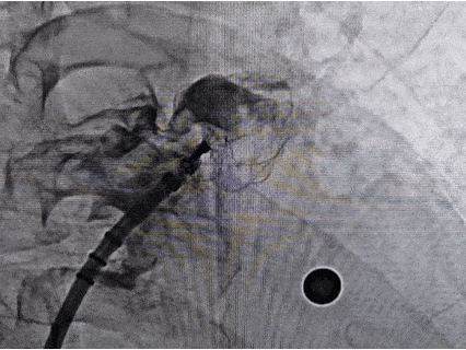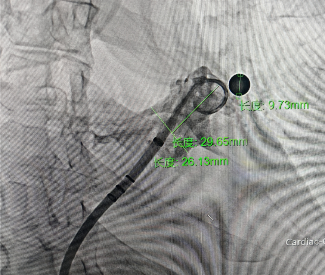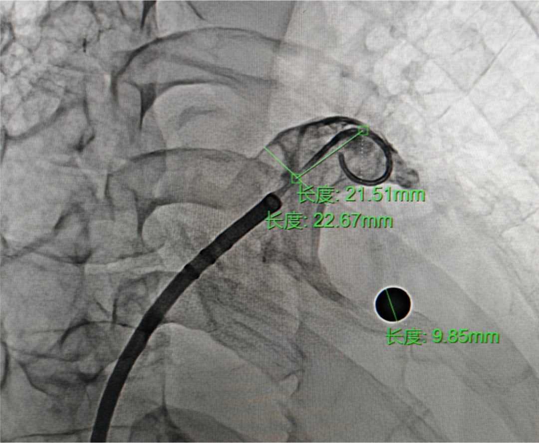 术中DSA肝位造影测量开口26.13mm,可用深度29.65mm;DSA右肩位造影测量开口22.67mm,深度21.51mm,心耳为“鸡翅型”左心耳,深度空间充分,综合考虑选择MemoLefort LAFDQ-29封堵器;MemoLefort封堵器远端为花苞型内扣保护,顺应性强,阻流膜高度覆盖,能更好适应心耳(包括浅心耳)内部结构及形态,达到稳定锚定。