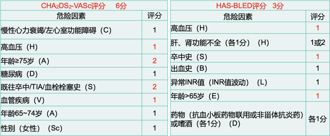 CHA2DS2-VASc评分6分,HAS-BLED评分3分。