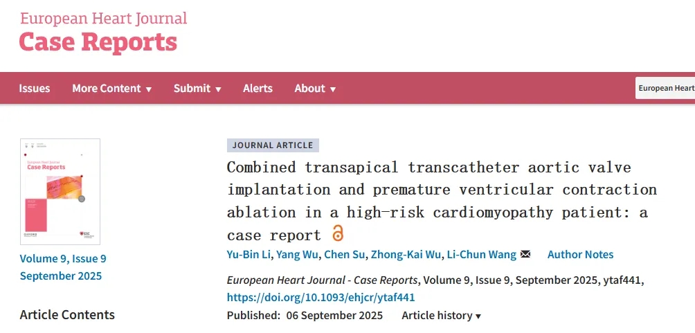 Li YB, Wu Y, Su C, Wu ZK, Wang LC. Combined transapical transcatheter aortic valve implantation and premature ventricular contraction ablation in a high-risk cardiomyopathy patient: a case report. Eur Heart J Case Rep. 2025 Sep 6;9(9):ytaf441. doi: 10.1093/ehjcr/ytaf441. PMID: 40977933; PMCID: PMC12448879.