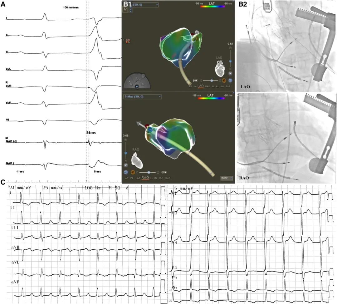 图2 消融靶点。(A) 室性早搏(PVC)起源点的心内电生理特征:最早激动点较体表心电图提前34 ms,消融导管(MAP1-2)可记录到心房电位。(B) 消融靶点的三维影像(B1)与X光投照体位(B2)。(C) 术后心电图。RAO:右前斜位,LAO:左前斜位。