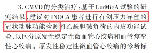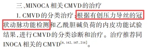 相较而言,对于CMVD的诊断,可能无创的诊断技术相对简单易行,但其准确性还是要依赖于有创的诊断技术。实际目前在临床上,推荐在介入诊断程序当中进行IDP(侵入性冠脉功能学检查),对于有条件的导管室,采用有创的基于压力导丝的冠脉功能学全面评估来进行CMVD的诊断。另外进行乙酰胆碱的冠脉内注射可以帮助诊断是否存在内皮功能的异常。