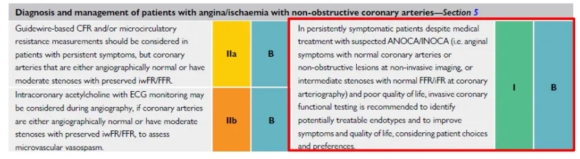 因此,冠心病患者应当进行两方面的检测,一个是冠脉功能学全面评估,通过压力导丝测定IMR、CFR等;同时应进行内皮功能的检测,通过注射乙酰胆碱诱发冠脉大血管/微血管的痉挛,以区分原发性稳定性微血管心绞痛和血管痉挛性心绞痛。