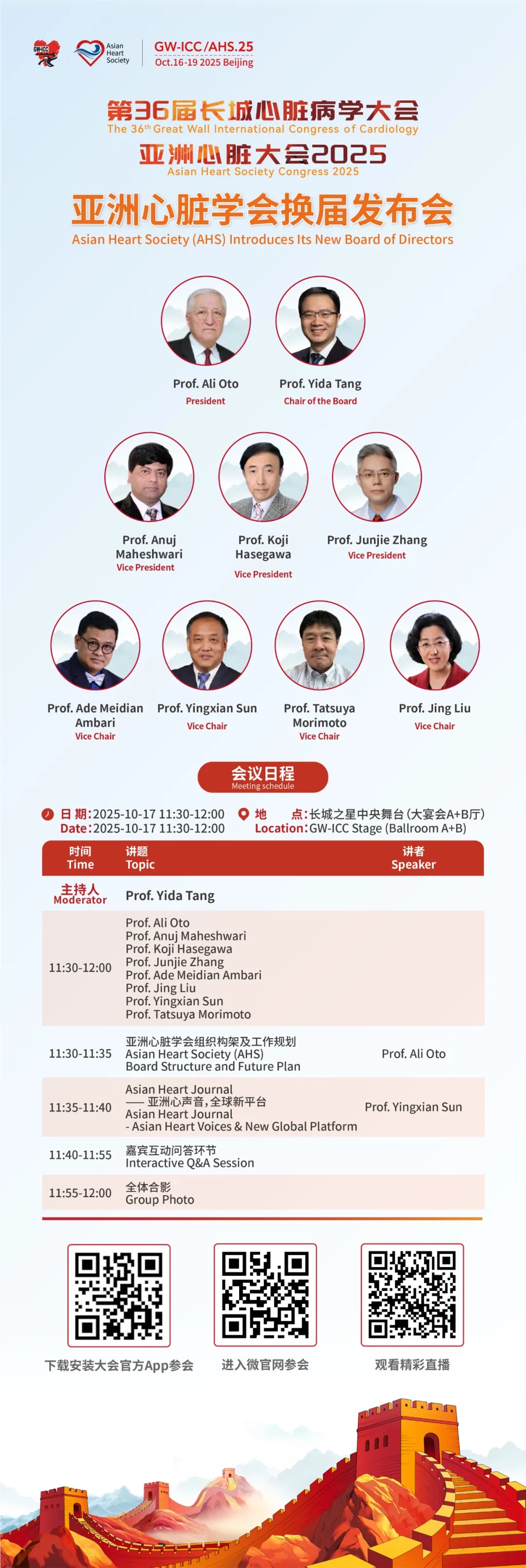 2025年10月17日11:30-12:00,第36届长城心脏病学大会(GW-ICC)暨亚洲心脏大会2025(AHS 2025)亚洲心脏学会换届发布会将在北京国家会议中心·长城之星中央舞台(大宴会A+B厅)正式举行。这场集结亚洲心血管领域专家学者的盛会,将解锁学会发展新蓝图、搭建全球学术交流新桥梁,诚邀您共赴见证、共探未来!