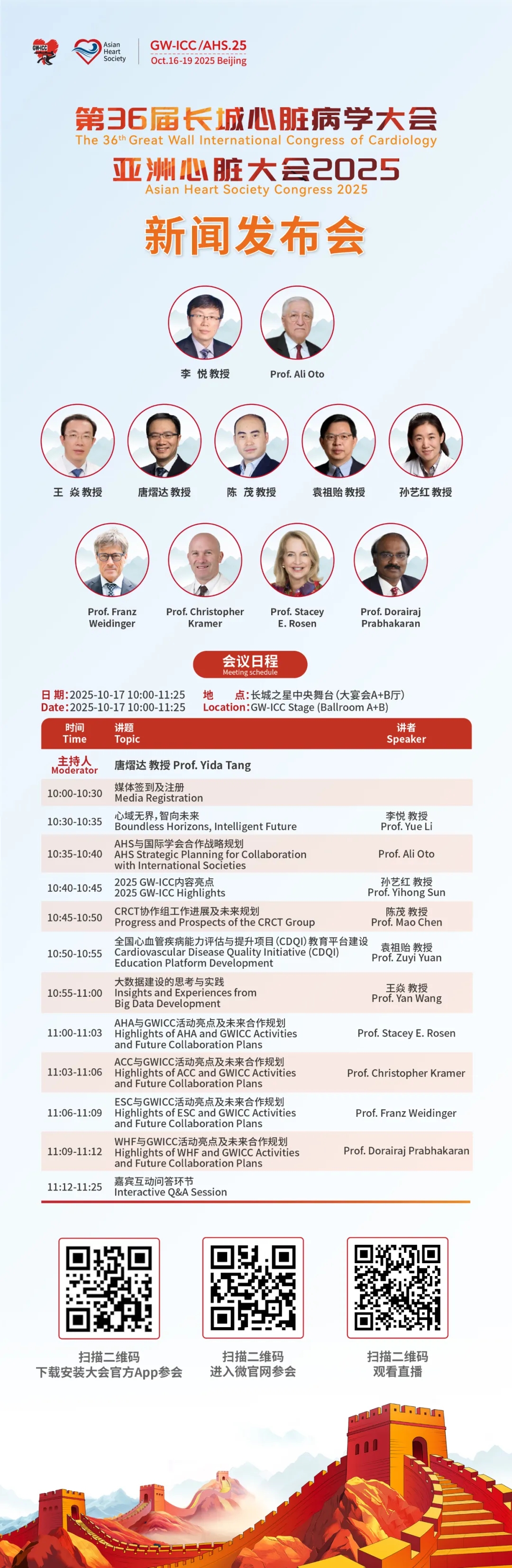 10月17日10:00-11:25,第36届长城心脏病学大会暨亚洲心脏大会2025新闻发布会将于北京国家会议中心·长城之星中央舞台(大宴会A+B厅)召开。