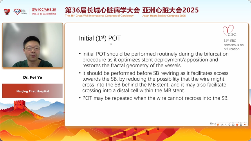 来自南京市第一医院的叶飞教授就左主干分叉病变中的核心技术——近端优化技术(POT)进行了深入浅出的讲解。他指出,由于左主干近、远段天然存在管腔直径差异,按远端管腔选择的支架在近端必然存在贴壁不良。POT技术正是解决这一问题的关键,其目的在于:优化近段支架的扩张与贴壁、减少对侧分支(回旋支)开口的阻碍、并为后续器械(如导丝重穿、球囊对吻)操作创造有利条件。
