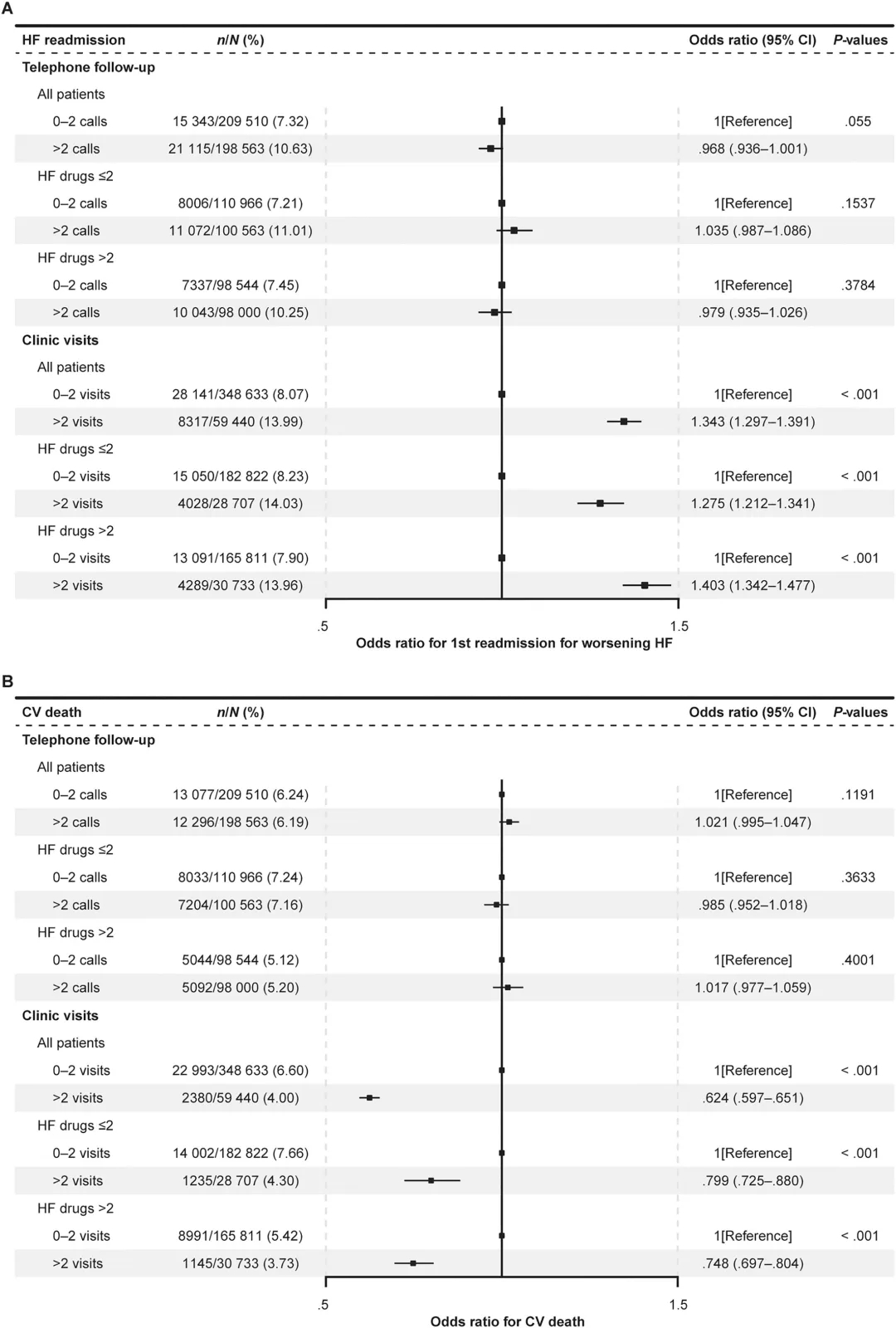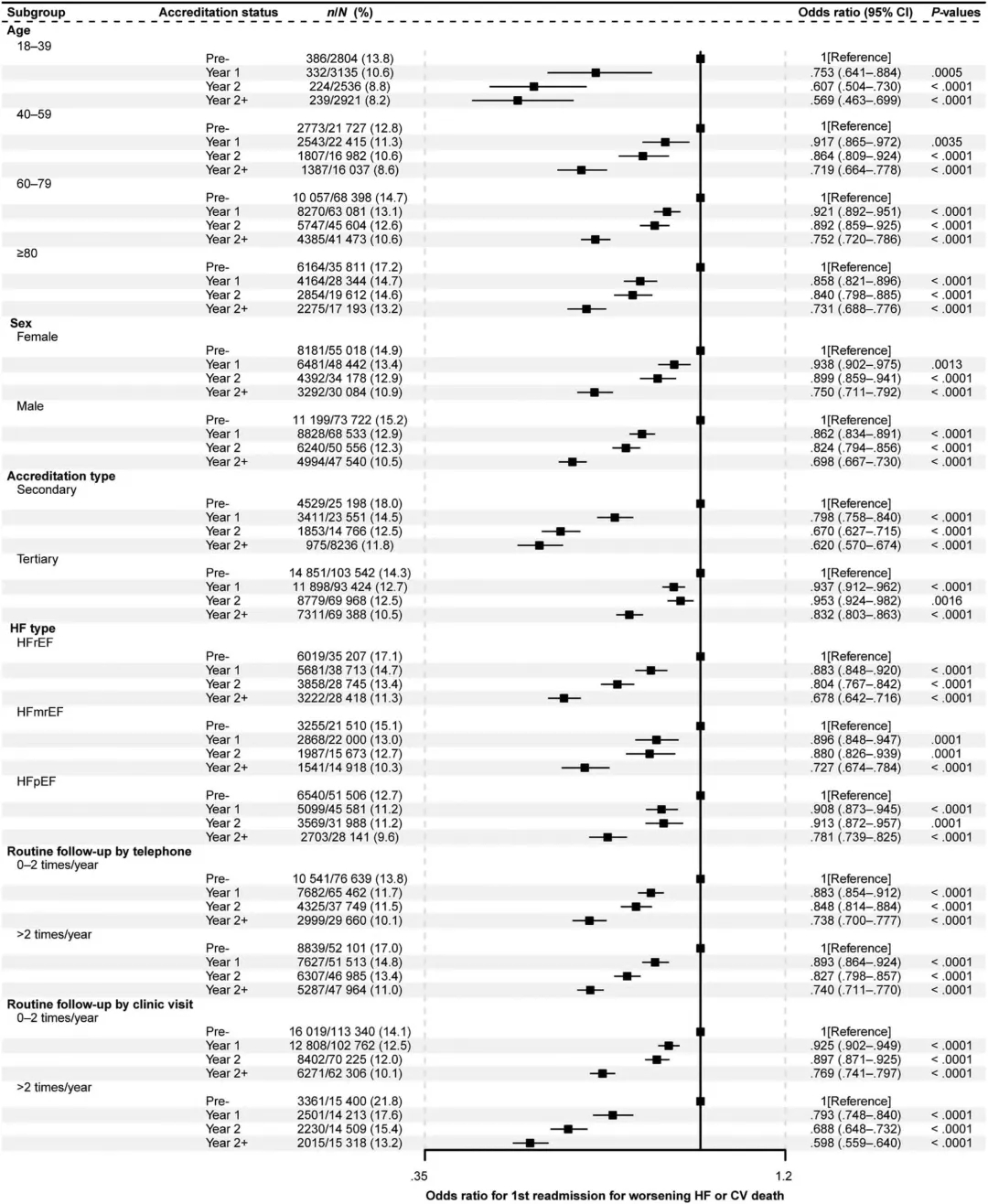 本研究同时探索了出院后随访方式与预后之间的关系。随认证进程推进,电话随访与门诊随访的比例均增加。但是,电话随访与终点事件关联不显著,而门诊随访与 1 年心血管死亡风险降低显著相关(OR 0.624,95% CI 0.597–0.651),提示出院后门诊评估并优化治疗可能与生存结局的改善相关,而电话随访可能只有助于收集数据而达不到优化治疗的目的。