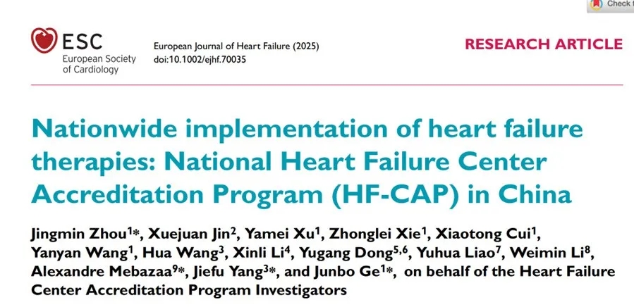 近日,复旦大学附属中山医院葛均波院士、周京敏教授与北京医院杨杰孚教授团队,基于心衰中心数据库开展研究,系统展示了心衰中心认证的体系化干预如何在真实世界中转化为GDMT实施的改进与结局的改善,相关成果以“Nationwide implementation of heart failure therapies: National Heart Failure Center Accreditation Program (HF-CAP) in China”为题发表于European Journal of Heart Failure(IF=10.8)。
