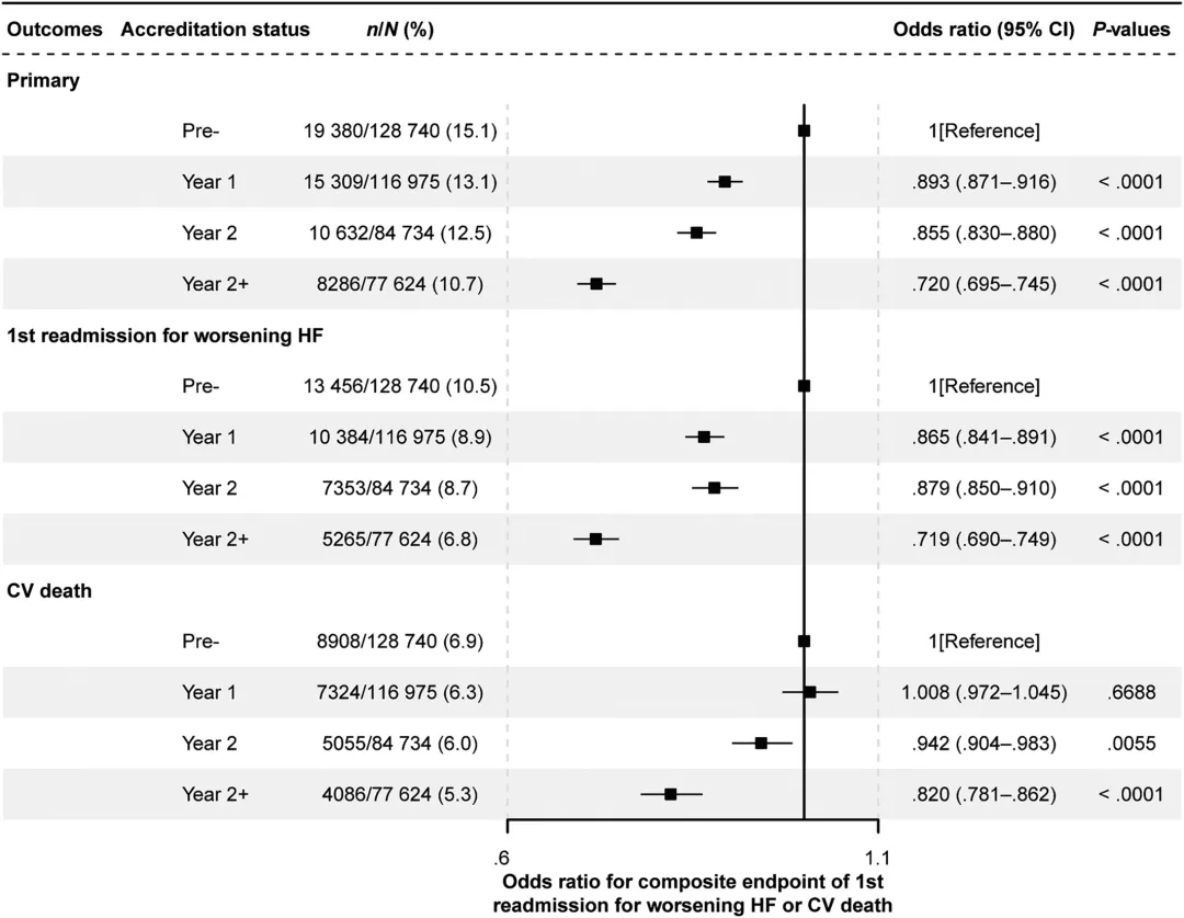 经过充分的多变量调整以控制混杂,认证年限与主要终点风险呈时间梯度递减关系:相较 Pre,Y1、Y2、Y2+ 的 OR 依次为 0.893(95%CI 0.871–0.916)、0.855(0.830–0.880)与 0.720(0.695–0.745)(均 p<0.0001);次要终点1年心衰再住院、1年心血管死亡的发生率亦随认证年限递增而递降,呈现一致的时间梯度效应。