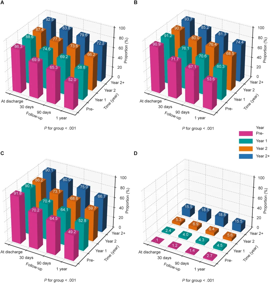 ACEI/ARB/ARNI、β受体阻滞剂与MRA的使用率,出院后1年与出院时比较,均存在一定幅度下降,但随认证年限增加,出院使用率更高、1年维持治疗率更高:Y2+组出院时三类用药覆盖率均>90%,1年时治疗率仍保持在>65%。总体趋势显示,认证时间越长,出院时GDMT使用率越高,出院1年使用率降幅越小(趋势检验均p<0.001)。