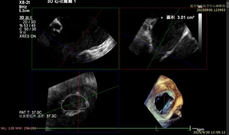 然而,心脏超声检查又带来致命一击,其结果显示,患者瓣口面积仅3.01cm²,房间隔高度仅3.8cm,且瓣叶组织脆弱、活动度差,这些心脏解剖结构指标均远低于常规手术安全范围。这意味着操作空间极其狭小,导管在心脏内的移动幅度受到严格限制,对器械的操控精度要求极高,任何微小偏差都可能导致严重并发症。这对手术团队的技术稳定性、心理素质和团队配合度提出了近乎极致的挑战。