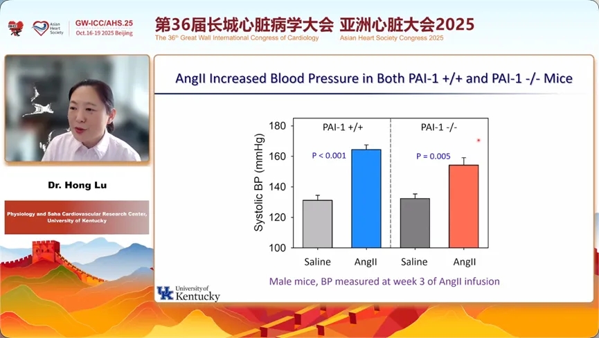 Hong Lu教授讲述了一项源于“意外发现”的原创性研究。她的团队在研究主动脉瘤时,无意中观察到一个惊人现象:纤溶酶原激活物抑制剂-1(PAI-1)基因敲除的小鼠,在给予高血压诱导剂(如血管紧张素II)后,主动脉安然无恙,心脏却发生了严重的自发性出血和继发性纤维化。