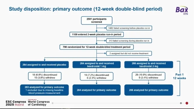 霍勇教授介绍,BaxHTN III是一项多中心、随机、双盲、安慰剂对照的Ⅲ期临床试验,旨在评估醛固酮合酶抑制剂Baxdrostat在未控制及难治性高血压患者中的疗效与安全性。入组患者为经两种或三种及以上降压药物(含利尿剂)治疗后坐位收缩压仍处于140–170 mmHg的高血压患者。研究于2023年11月至2025年2月期间共筛选2591例,其中1109例进入为期两周的安慰剂导入期,最终796例患者按1:1:1比例随机分组,分别接受每日一次Baxdrostat 2 mg、1 mg或安慰剂治疗。主要终点为治疗12周后坐位收缩压较基线的变化。