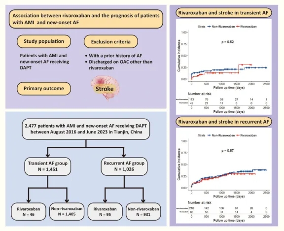 急性心肌梗死(AMI)后新发房颤(AF)与患者中风和死亡风险升高密切相关。然而,目前国内外相关指南对于该人群的抗血栓治疗策略尚无明确推荐。本研究旨在评估利伐沙班在合并新发房颤的急性心肌梗死患者中应用与其临床结局之间的关联。