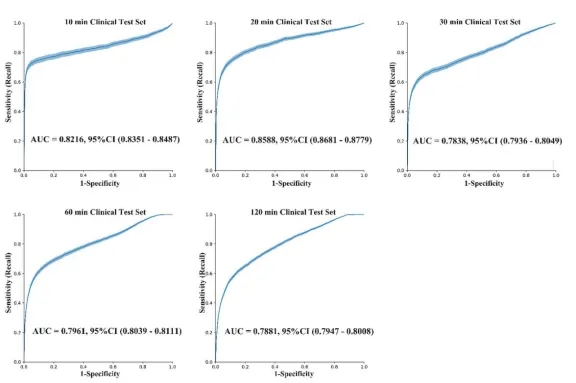AI算法在短期AF预测中表现优异,尤其于较短时间内预测性能更为突出。在前瞻性测试队列中,10分钟预测间隔的敏感性达69.57%,特异性为97.50%,NPV超过99%。随着预测时间延长(如120分钟),敏感性下降至58.27%,但特异性仍保持较高水平(87.75%)。ROC曲线与F1优化模型为平衡敏感性与特异性提供了互补策略,适应不同临床需求。值得注意的是,引入更多临床参数并未显著提升模型的预测效能。