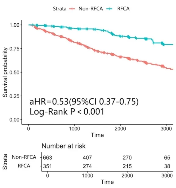 中位随访时间为1857天,期间共249例患者发生主要终点事件。与非RFCA组相比,RFCA组复合事件发生率较低(12.3% vs. 31.1%;校正后风险比[aHR]:0.53 [95% CI:0.37–0.75];P<0.001),全因死亡率(8.8% vs. 35.4%;aHR:0.45 [95% CI:0.31–0.67];P<0.001)和心血管死亡率(4.6% vs. 22.8%;aHR:0.38 [95% CI:0.22–0.64];P<0.001)均显著降低。
