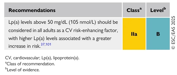 指南建议,应考虑在每位成年人的一生中至少检测一次 Lp(a) 水平,并将高于 50 mg/dL 视为一个风险增强因素,用以辅助临床决策。在进行风险评估时,尤其是对于中等风险或临近治疗决策阈值的个体,Lp(a) 升高可作为将其重新分类至更高风险级别的依据,从而指导更积极的降脂干预。