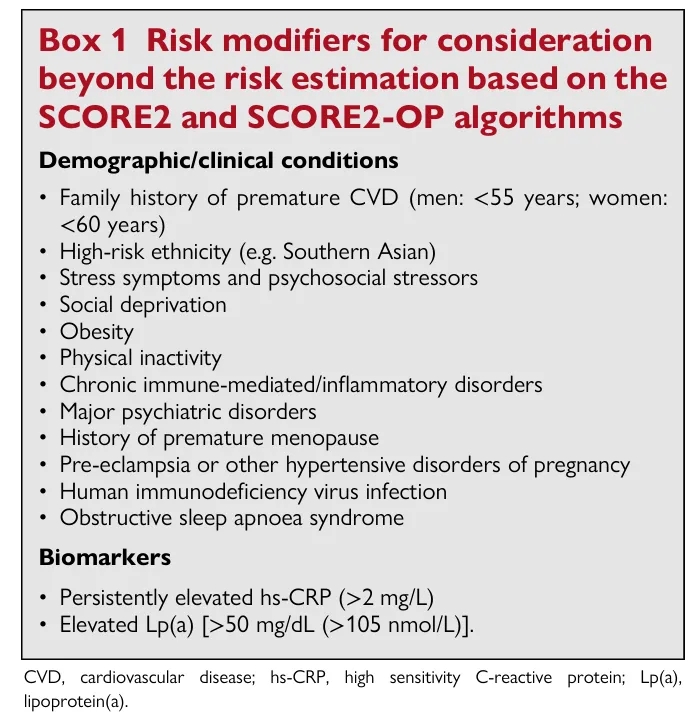 同时,指南强调可使用「风险修正因子」对评估结果进行个体化校准。对于中等风险或临近治疗阈值的个体,若影像学发现亚临床动脉粥样硬化(如 CAC 积分升高等),或存在 Lp(a) 升高等其他因素,应考虑将其风险等级上调,以启动更积极的干预。