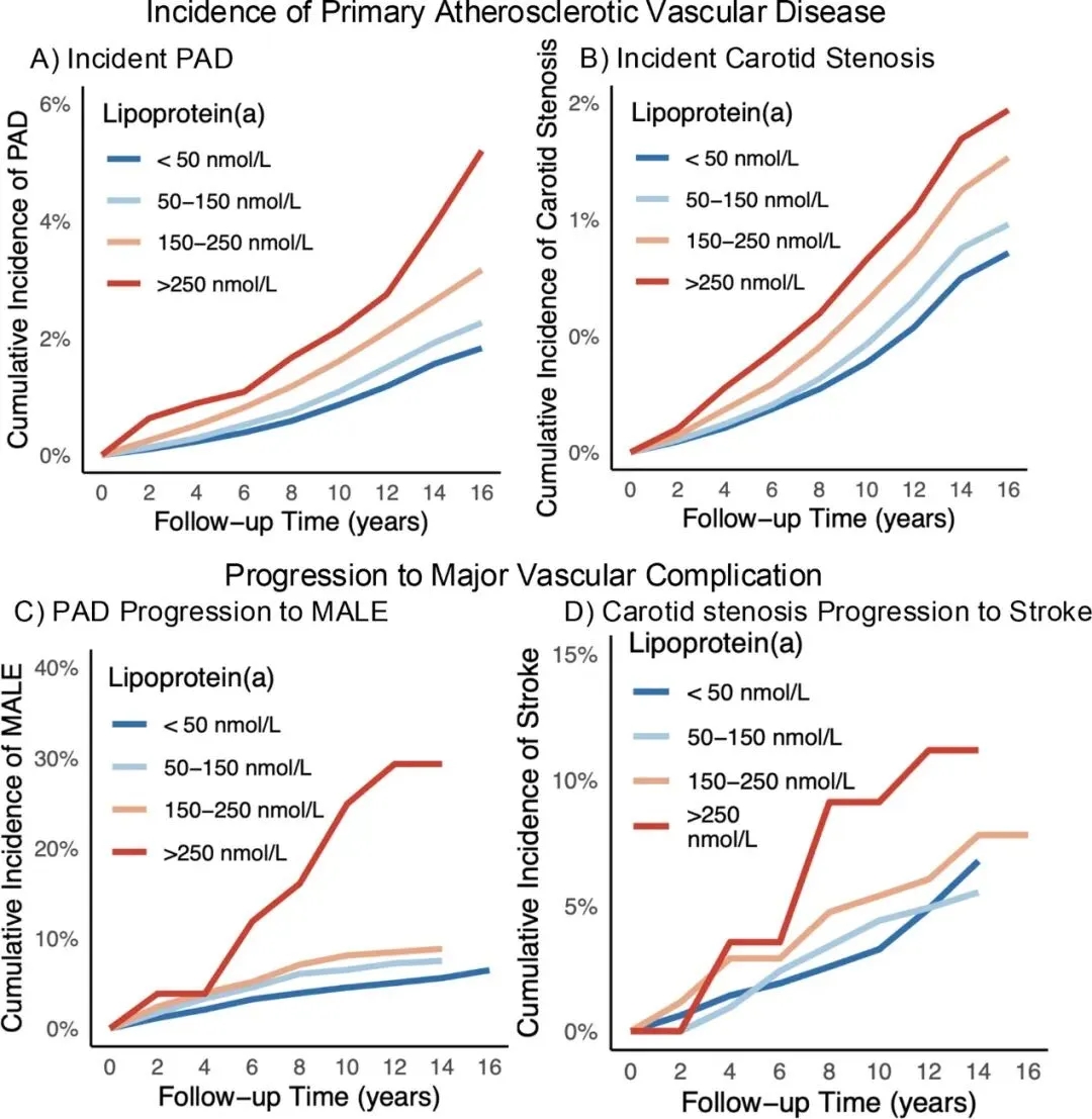 2025年9月2日发表于《Circulation》的一篇研究,对英国生物银行(UKB)中的460,544名前瞻性测量Lp(a) 浓度的参与者数据进行分析,采用Cox比例风险回归模型分析Lp(a) 浓度与外周动脉疾病(PAD)、颈动脉狭窄以及分别进展至首次主要不良肢体事件和首次中风的关联。