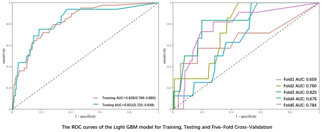 研究人群1年ACM发生率为3.99%。在8个模型中,LightGBM算法表现出最佳的预测性能。SHAP方法确定D-二聚体、血红蛋白、钾、血小板计数、Killip分级和中性粒细胞是关键特征。训练集中的LightGBM模型预测,既往ICH史患者行PCI后1年ACM的ROC为0.829(95%CI:0.769–0.890)。在内部验证集中,LightGBM模型的ROC为0.831(95%CI:0.722–0.939),灵敏度为0.750,特异性为0.723,准确度为0.724,F1评分为0.740。