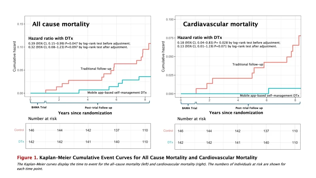 BAMA研究是一项平行设计、开放标签、单中心的随机对照试验,于2016年4月和2018年6月进行,将300例冠心病患者按1:1的比例随机分组。干预组结合DTx进行定期随访,对照组则仅接受常规的医院随访护理。两组随访于2018年完成,参与者可以选择之后是否继续使用DTx。由于预算原因,DTx服务于2021年终止。在这项BAMA的扩展研究中,参与者在随机分组后接受了8年以上的随访,主要终点为全因死亡率,次要终点为8年内的心血管死亡率。采用Kaplan-Meier曲线和Cox回归分析研究DTx的Legacy效应。
