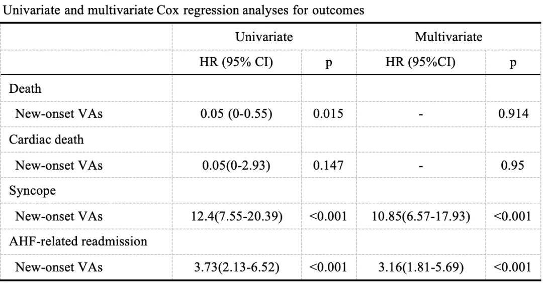 共纳入2013年1月至2013年12月入组接受PCI的患者9,431例。其中,336例(3.6%)患者在出院后随访期间出现新发VA。在6年的随访期间,共有368名患者死亡,117名患者因AHF住院,76名患者出现晕厥。多因素Cox分析表明,新发VA与全因死亡率或心源性猝死死亡率没有独立关联。