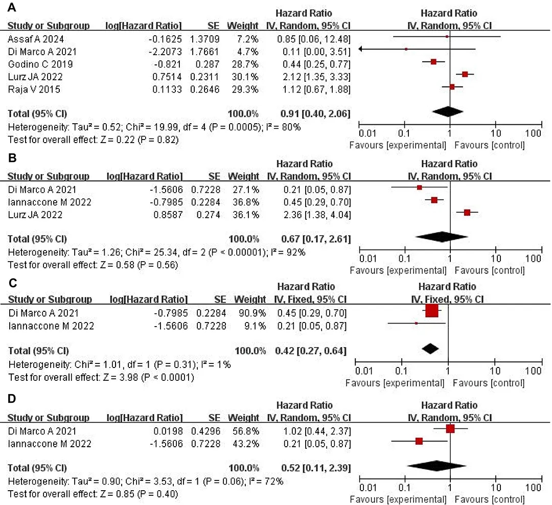 研究纳入10项研究共5,966名患者。荟萃分析表明,CTO血运重建可能与VA发生率降低有关,两者不存在显著的统计学意义(未调整HR=0.9,95%CI:0.40-2.06,I²=80%,P=0.82,调整后HR=0.67,95%CI:0.17-2.61,I²=92%,P=0.56)。在ICD患者中,CTO血运重建可显著降低VAs发生率(调整后HR=0.42,95%CI:0.27-0.64,I²=1%,p<0.01)。在心肌梗死相关CTO中,血运重建可降低VAs发生率(未调整HR=0.42,95%CI:0.27-0.64,I²=1%,p<0.01),调整后HR为0.52,未达到统计学意义(95%CI:0.11-2.39,I²=72%,p=0.40)。CTO血运重建可改善全因死亡率(调整后HR=0.54,95%CI:0.35-0.83,I²=0%,p<0.01),但对心源性猝死结局影响不大(调整后HR=1.00,95%CI:1.00-1.00,I²=43%,p=1.00)。