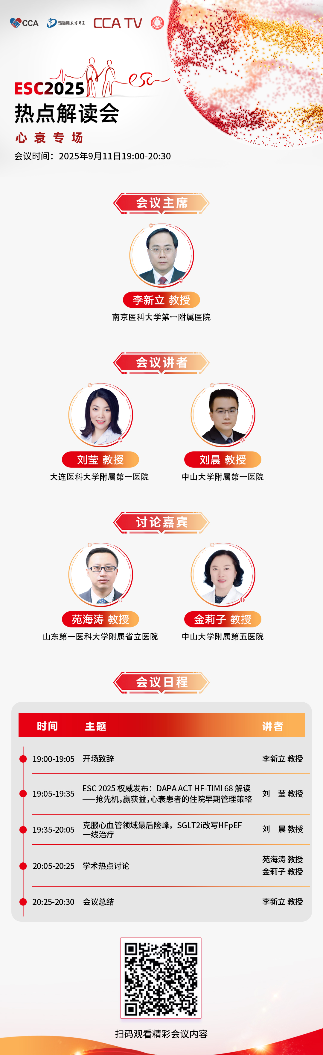 洞察ESC前沿,解码心衰诊疗新策略!ESC2025热点解读会-心衰专场第二场将于2025年9月11日19:00-20:30线上开启,汇聚国内心血管领域多名专家,深度解析2025年欧洲心脏病学会(ESC)年会心衰领域突破性研究。此次会议由南京医科大学第一附属医院李新立教授担任主席,大连医科大学附属第一医院刘莹教授将解读ESC 2025权威研究DAPA ACT-HF-TIMI 68,剖析心衰患者住院早期管理新策略;中山大学附属第一医院刘晨教授将聚焦心衰GDMT治疗,深入解析SGLT2i在HFpEF患者中的一线应用突破。还邀请到山东第一医科大学附属省立医院苑海涛教授、中山大学附属第五医院金莉子教授展开多维学术对话,碰撞临床智慧。扫描海报内二维码即可预约观看,与全国心血管同仁共飨学术盛宴,9月11日晚7点,我们不见不散!