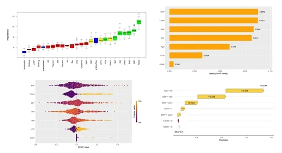 本研究回顾性纳入2016年9月至2023年6月期间LVEF≤50%的HF患者。采用Logistic回归分析终点事件相关因素,并通过Boruta特征选择算法及基于机器学习的SHAP(Shapley Additive Explanations)模型评估这些因素与终点的关联。