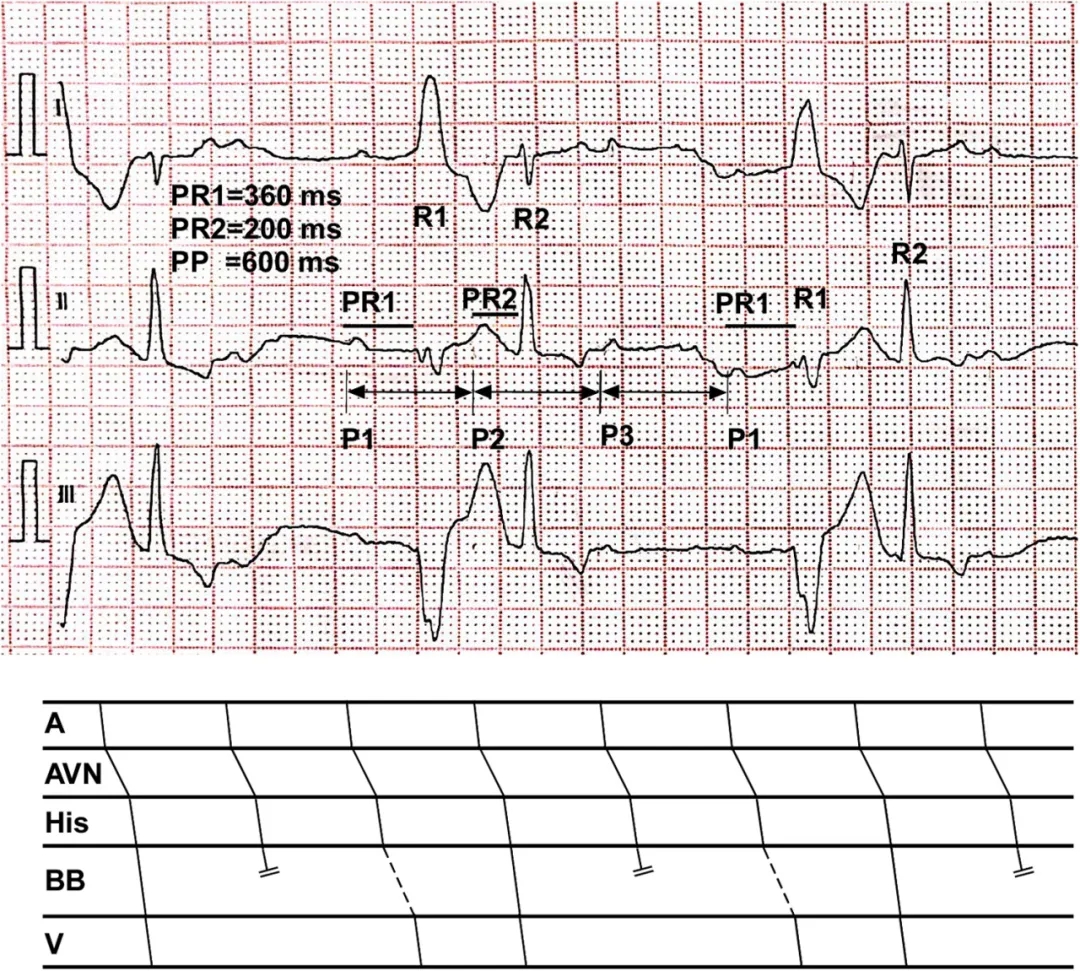 在3:2文氏周期中,长RR间期后的首个PR间期(360 ms)显著长于短RP间期后的PR间期(200 ms),表现出RP间期与PR间期呈正相关关系,符合反向文氏现象的特征。然而存在矛盾现象:较长PR间期后出现宽QRS波(室内传导阻滞),而较短PR间期后反而传导正常。