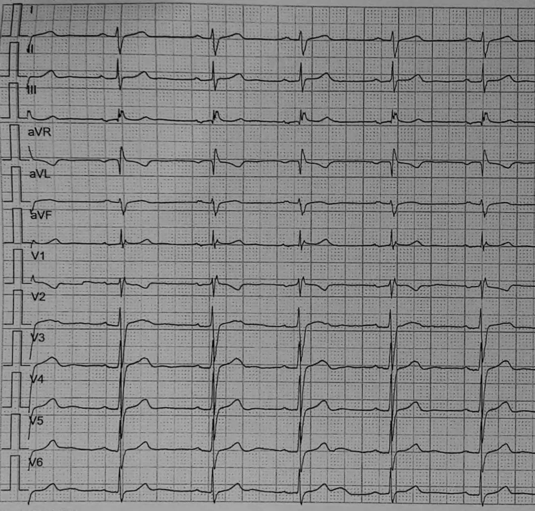 图5 4年随访时心电图显示不完全右束支传导阻滞