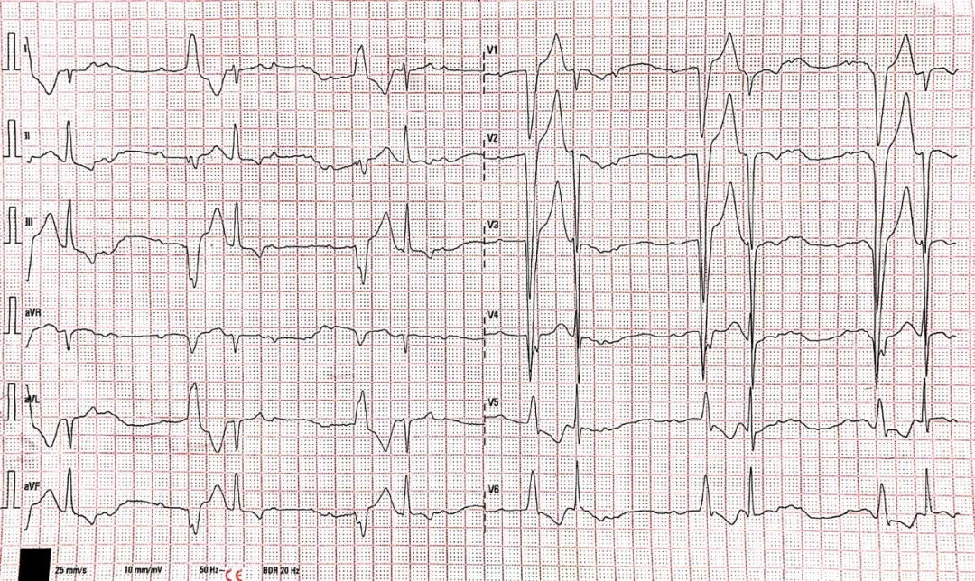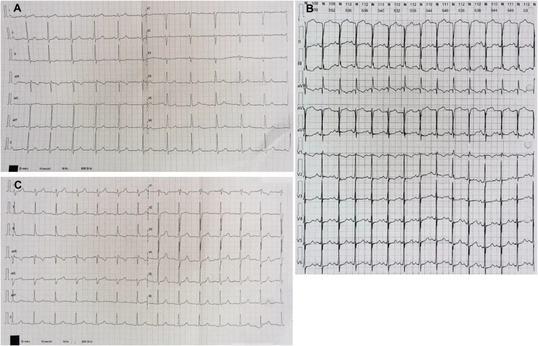 术后ECG示窦性心律伴不完全性RBBB,电轴正常。超声显示主动脉瓣形态正常,微量反流。术后第3天因心律平稳拔除心外膜起搏导线。然而,在术后第6天(2021年6月1日),患者诉突发心悸,ECG显示心律不齐和间歇性宽QRS波群(图2),几分钟后恢复正常。约4小时后发生晕厥,远程监护显示AVB,间歇性交替通过左或右束支传导,进而演变为全心停搏,最长停顿达7.4秒(图3C)。