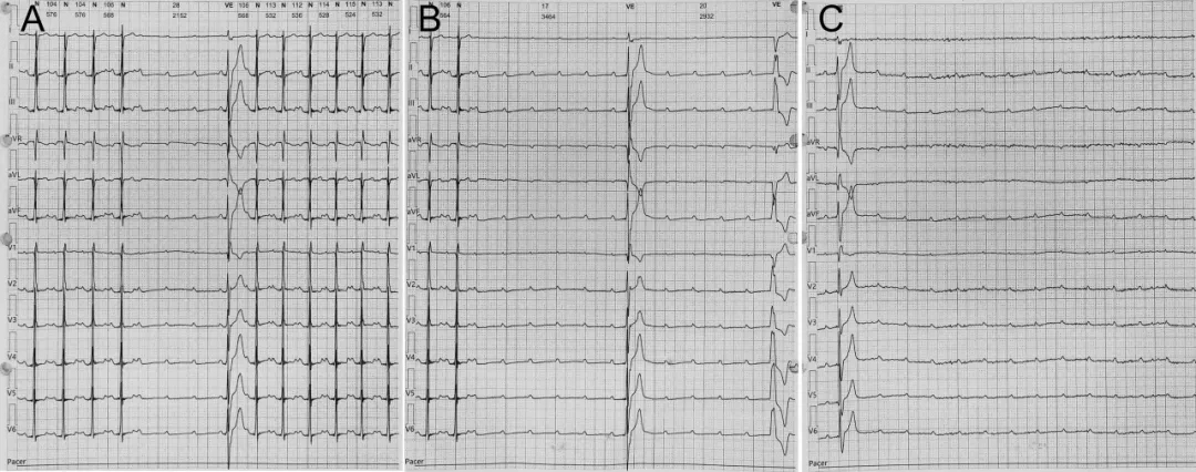 注:(A) 第一次和(B) 第二次AVB;(C) 心脏骤停7.4秒